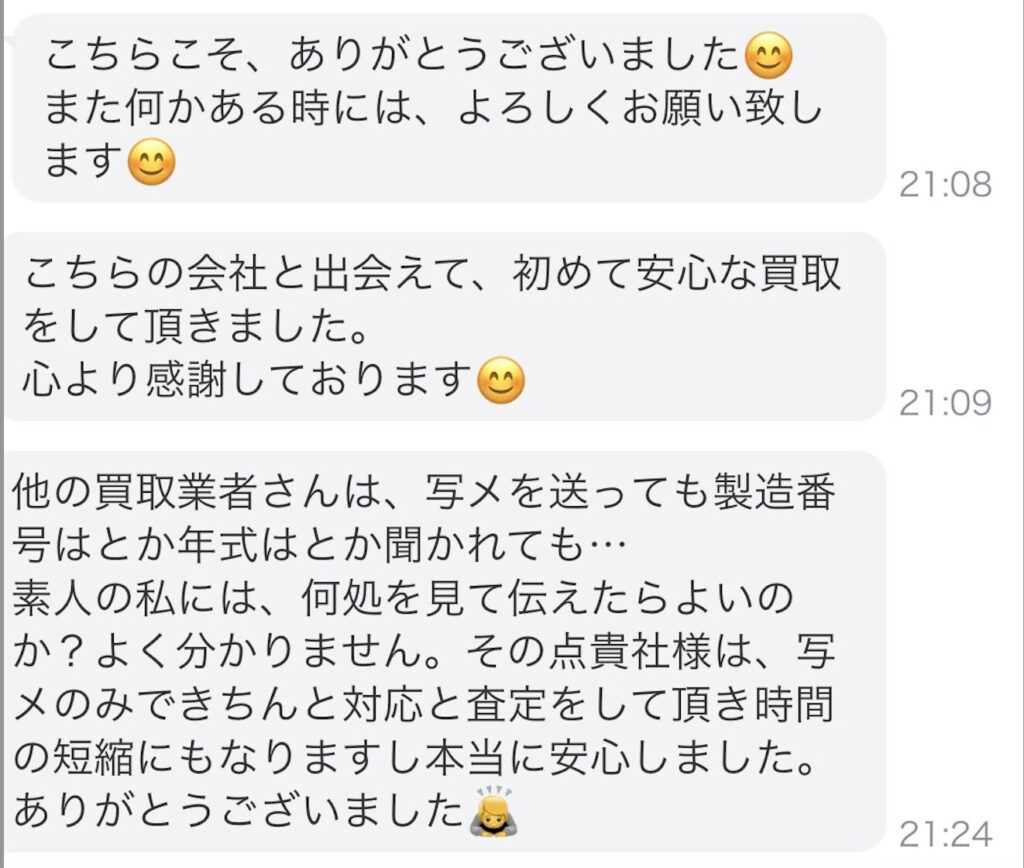 もし傷があったとしても、その場で**「ここに傷があるので、この金額になります」と納得いただけるまでご説明**します。 つまり、商品を送る前にお互いの認識ズレをゼロにできるのです。