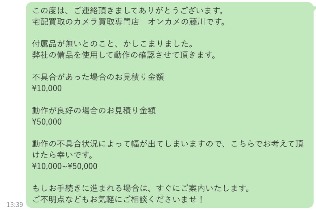 - 送る前に金額確定 画面越しにカメラの状態を拝見し、その場で査定額を提示します。「付属品がないので〇〇円になります。弊社でカメラの動作状況を確認し動作に問題が無ければ〇〇円になります。動作に不具合があった場合は、画像か動画を用いて説明させて頂きます。」と明確にお伝えし、ご納得いただいてから取引成立となります。